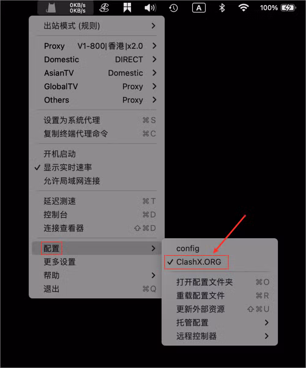 安装完成后,系统菜单栏(顶部菜单区)应会出现一个类似“猫咪图标”或 “ClashX / 小猫咪” 的图标,点击它即可打开主菜单与功能设置界面。