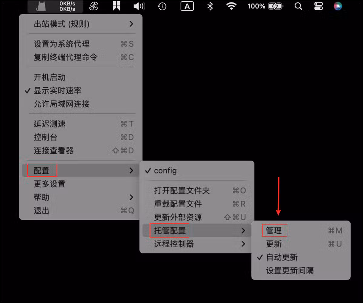 点击顶部状态栏的猫咪图标 → 配置 (Configuration) → 托管配置 (Managed Config) → 管理 (Manage)。